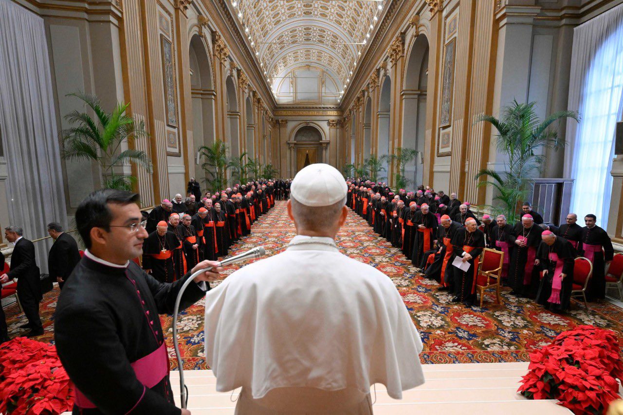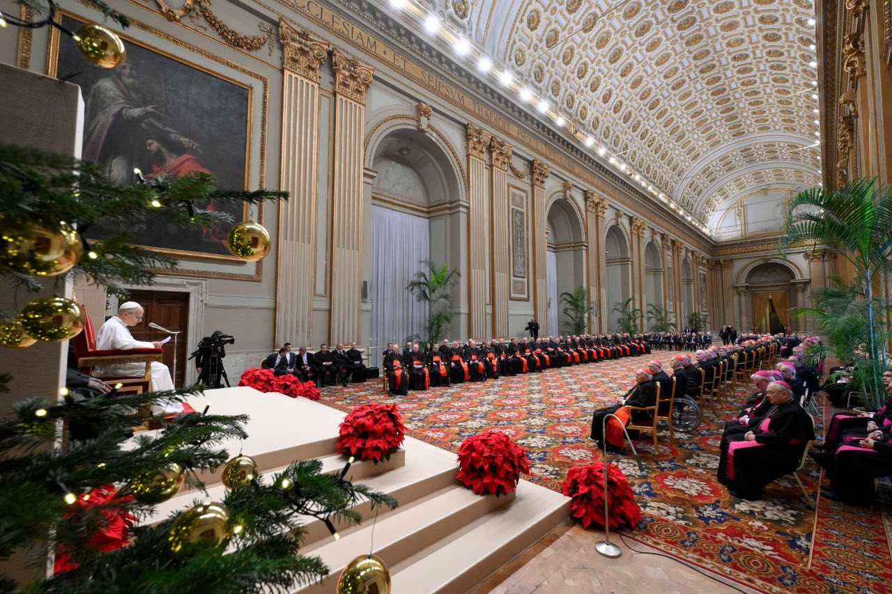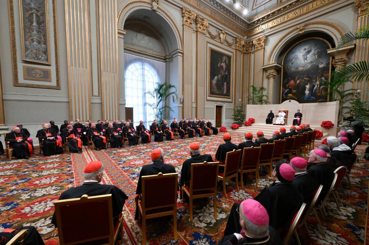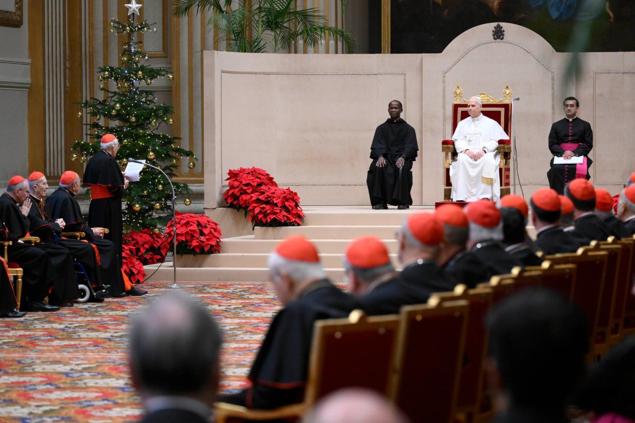 (ZENIT Noticias / Ciudad del Vaticano, 22.12.2025).- Por la mañana del lunes 22 de diciembre, el Papa León XIV presidió uno de los encuentros más relevantes y tradicionales del año: el encuentro con los cardenales residentes en Roma y con la Curia Romana en ocasión de las felicitaciones navideñas. Se trata de un momento importante porque el Papa articula y presenta su idea de Iglesia para el nuevo año o, en este caso, al inicio de su pontificado. La audiencia tuvo lugar en la Sala de las Bendiciones de la Basílica Vaticana. Ofrecemos a continuación la traducción al castellano.