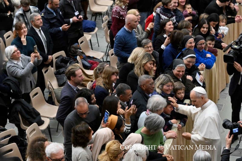 Pero hoy estoy contento con este momento familiar, ya casi en vísperas de Navidad. Lo vivimos ante el belén, que de hecho está presente también aquí, en esta escena de la Natividad donada por Costa Rica. En el belén, la imaginación popular ha insertado a menudo muchas figuras tomadas de la vida cotidiana, que pueblan el espacio alrededor de la gruta. Así, además de los inevitables pastores, protagonistas del acontecimiento según el Evangelio, podemos encontrar figuritas que representan diferentes oficios: el herrero, el posadero, la posadera, la lavandera, el afilador, etcétera. Por supuesto, se trata de oficios de antaño: algunos de ellos han desaparecido o se han transformado por completo. Sin embargo, conservan su significado dentro del belén. Nos recuerdan que todas nuestras actividades, nuestras ocupaciones cotidianas, adquieren su pleno sentido en el designio de Dios, que tiene su centro en Jesucristo.