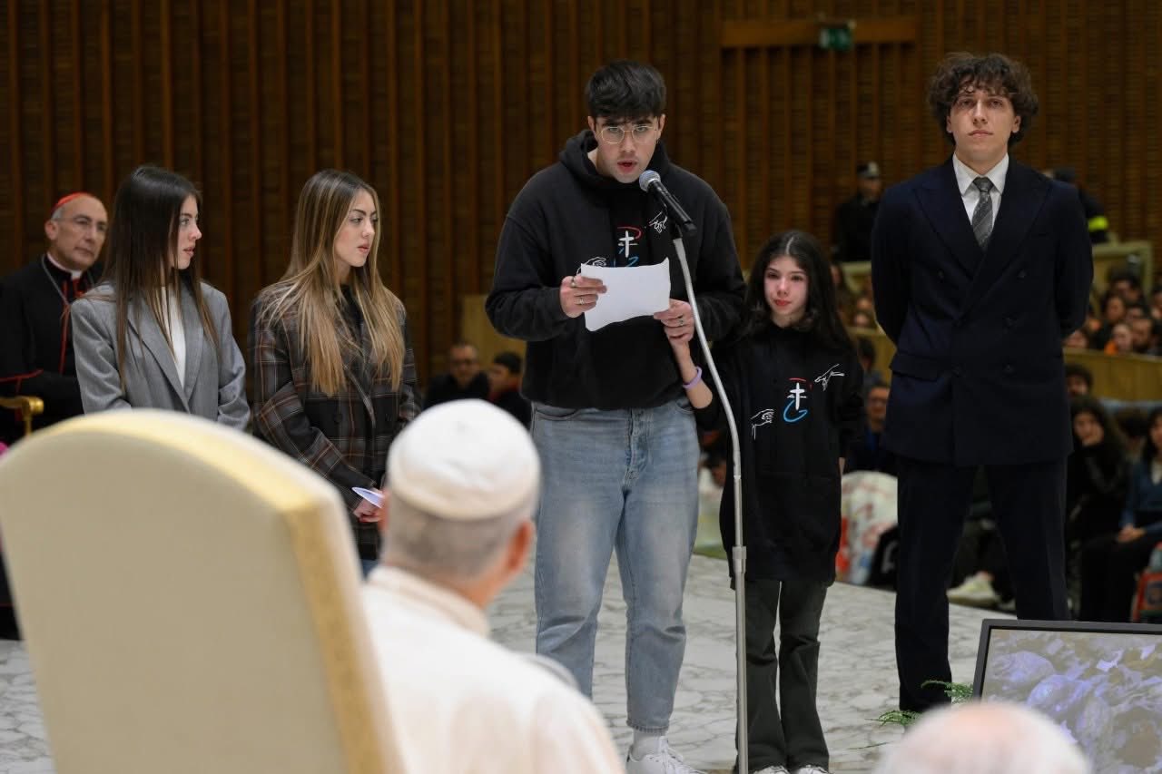 De este encuentro con Jesús surge la fuerza para cambiar nuestras vidas y transformar la sociedad. Como señalaron Francesca y Michela, la luz del Evangelio ilumina verdaderamente nuestras relaciones: a través de las palabras y los gestos cotidianos, se expande, atrayendo a cada persona a su calor. Entonces, un mundo gris y anónimo se convierte en un lugar acogedor, a escala humana, precisamente porque está habitado por Dios. Me alegra que en sus entornos experimenten relaciones auténticas: lo que experimentan en las parroquias romanas, en el oratorio y en las asociaciones, ¡no pueden guardárselo para sí mismos! No esperen que el mundo los reciba con los brazos abiertos: la publicidad, que busca vender algo para consumir, tiene mayor audiencia que el testimonio, que busca construir amistades sinceras. Por lo tanto, actúen con alegría y tenacidad, sabiendo que para cambiar la sociedad, primero debemos cambiarnos a nosotros mismos. Y ya me han demostrado que son capaces de cambiarse y construir estas amistades. ¡Así es como podemos cambiar el mundo, así es como podemos construir un mundo de paz!