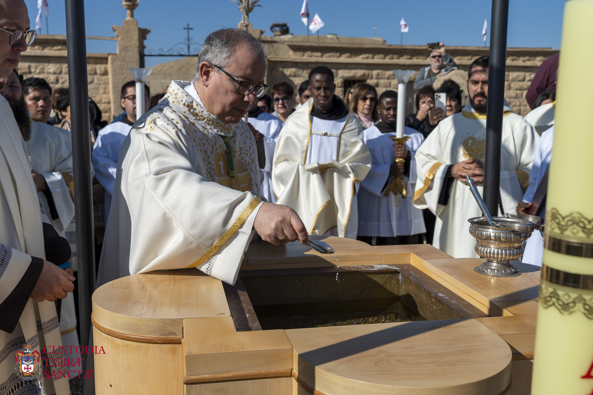 Posteriormente, la comunidad procedió en procesión al lugar del Bautismo. Al llegar a la orilla del río, los fieles participaron en la celebración eucarística al aire libre, en un ambiente de reflexión y participación, marcado por la sencillez del lugar y el poderoso simbolismo de las aguas del Jordán. Durante la Misa, se proclamó el pasaje evangélico que conmemora el bautismo de Jesús. La homilía enfatizó cómo, a través del bautismo, todo creyente se convierte en hijo de Dios y miembro vivo de la Iglesia, llamado a dar testimonio del Evangelio en la vida diaria.