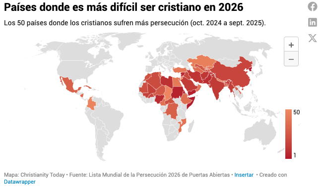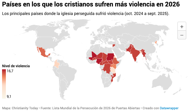 (ZENIT Noticias / Roma, 18.01.2026).- Los últimos datos globales sobre la persecución anticristiana presentan un panorama desolador e inquietante. Según la Lista Mundial de Vigilancia 2026, publicada por Puertas Abiertas el 14 de enero, el número de cristianos que viven bajo niveles altos o extremos de persecución ha ascendido a más de 388 millones en todo el mundo, un incremento de 8 millones en comparación con el año anterior. En la práctica, esto significa que uno de cada siete cristianos a nivel mundial se enfrenta a graves discriminaciones, presiones o violencia debido a su fe.