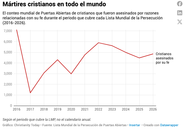 Las estadísticas de violencia refuerzan la gravedad de la situación. Tras un descenso temporal en 2025, el número de cristianos asesinados por motivos relacionados con su fe volvió a aumentar, de 4.476 a 4.849, un promedio de 13 muertes al día. Nigeria sigue siendo el epicentro de la violencia letal, con 3.490 de esas muertes, aproximadamente el 70 % del total mundial. Desde 2020, estimaciones conservadoras sugieren que más de 25.200 cristianos han sido asesinados solo en Nigeria.