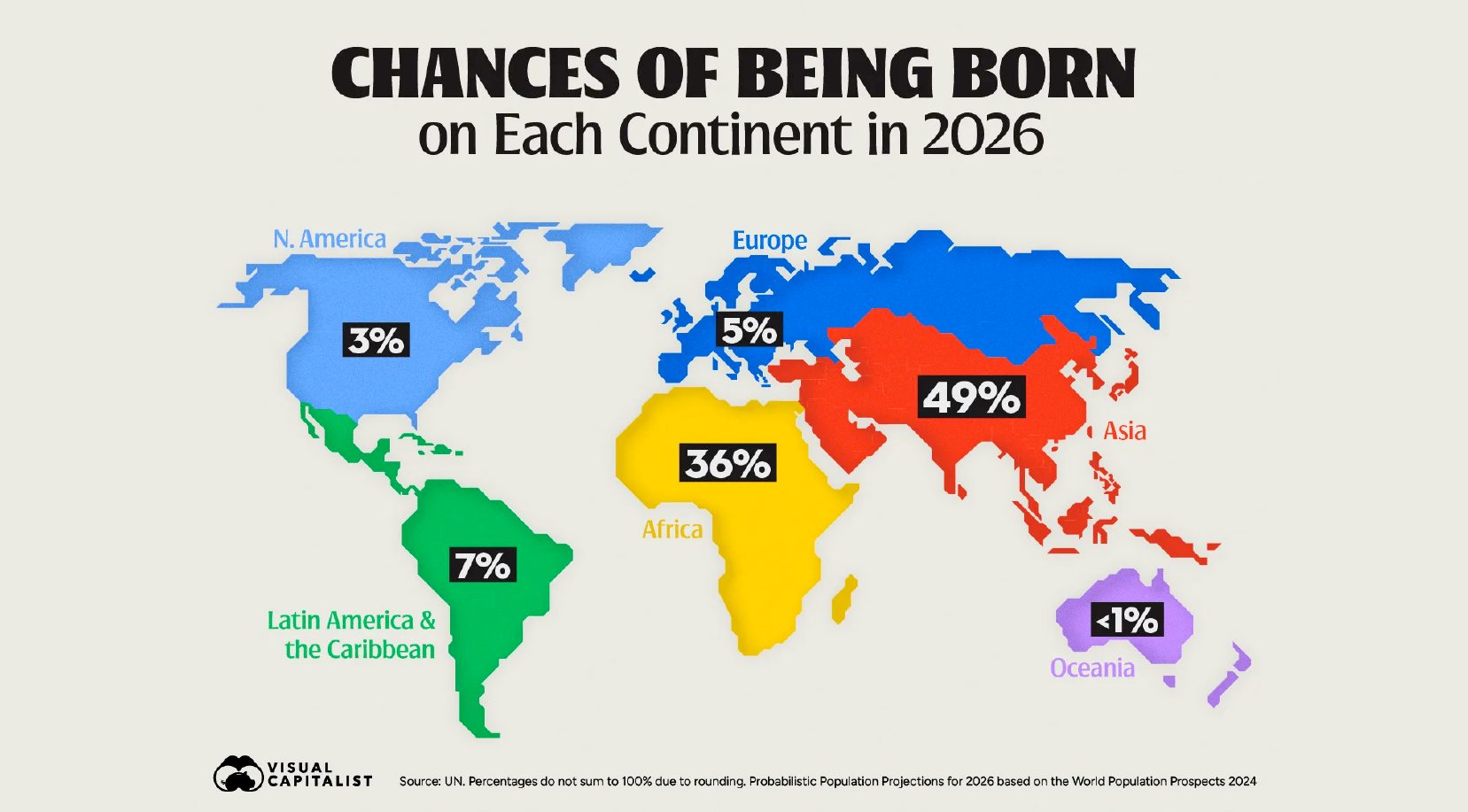La abrumadora mayoría de los nuevos miembros de la humanidad (el 85 %) nacerá en África y Asia. Se espera que solo Asia registre aproximadamente 64,9 millones de nacimientos en 2026, lo que representa alrededor del 49 % de todos los nacimientos mundiales. África le seguirá con más de 47 millones de nacimientos, el 36 % del total. América Latina y el Caribe representarán el 7 %.