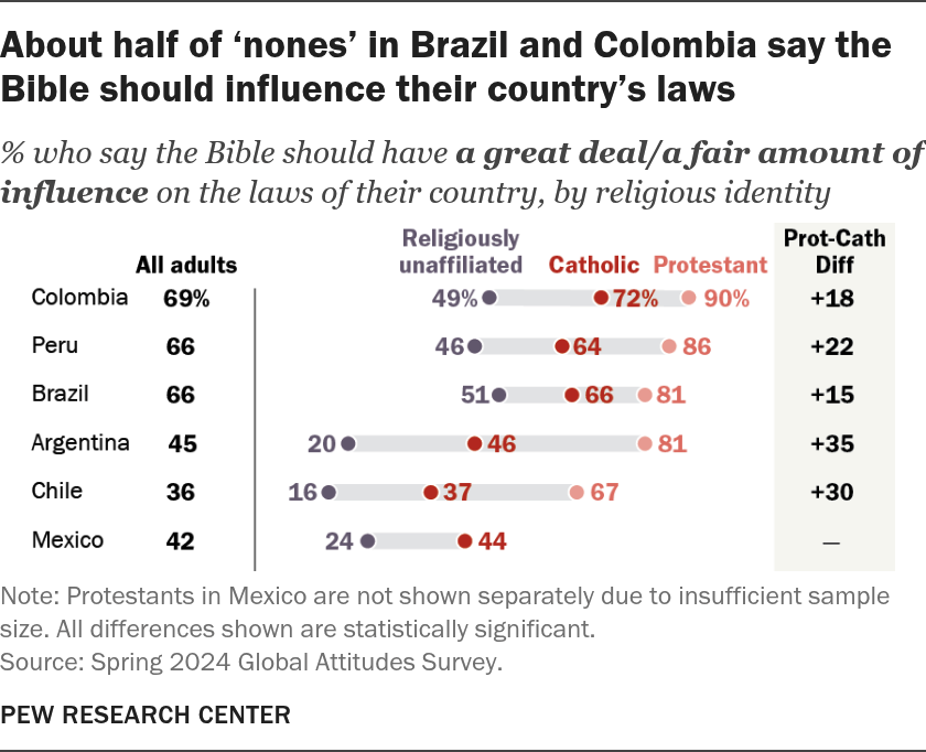 Quizás la dimensión más sensible políticamente de esta influencia religiosa se refiere al ámbito jurídico. En Brasil, Colombia y Perú, cerca de dos tercios de los adultos creen que la Biblia debería tener una influencia significativa en las leyes nacionales. No se trata de una opinión minoritaria, sino de una postura mayoritaria en algunos de los países más grandes de la región. Los protestantes vuelven a destacar: en Argentina, el 81% apoya la influencia bíblica en la legislación, frente al 46% de los católicos. Incluso entre quienes no profesan ninguna religión, la idea mantiene cierta aceptación: el 51% en Brasil y el 49% en Colombia apoyan dicha influencia, seguidos de cerca por Perú con un 46%.