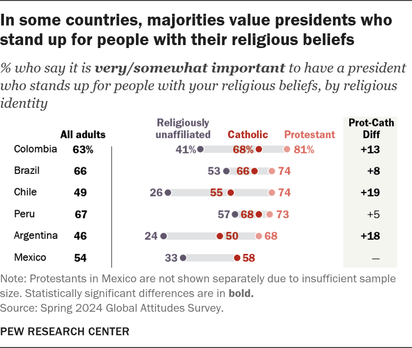 Datos recientes de una encuesta realizada en 2024 a más de 6200 adultos en seis importantes países latinoamericanos —Brasil, México, Colombia, Argentina, Perú y Chile— sugieren que la religión conserva un papel público significativo, aunque desigual. En Brasil, Colombia y Perú, aproximadamente dos tercios de los encuestados consideran importante, o muy importante, que un presidente defienda las creencias religiosas de la población. En Argentina, Chile y México, esa proporción se reduce a cerca de la mitad, lo que indica una sensibilidad pública más secularizada, pero no una total desconexión.