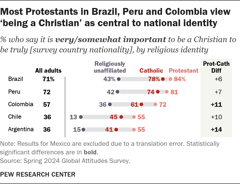 Más allá del liderazgo, la religión también influye en la concepción de la pertenencia nacional. En Brasil, Colombia y Perú, la mayoría de los encuestados afirma que ser cristiano es, al menos en cierta medida, importante para ser un miembro «auténtico» de la nación. En Colombia, la distinción entre denominaciones se hace particularmente visible: el 72 % de los protestantes vincula la identidad nacional con el cristianismo, en comparación con el 61 % de los católicos. Por el contrario, Argentina y Chile muestran una conexión más débil entre la identidad religiosa y la pertenencia nacional, lo que refleja procesos más prolongados de secularización y pluralización.