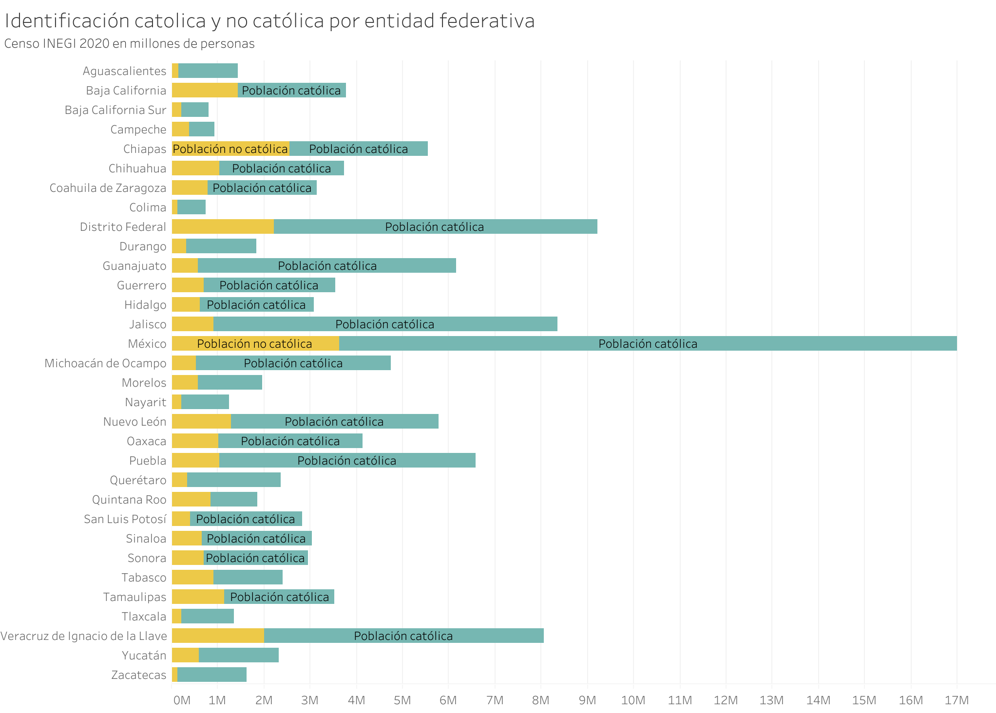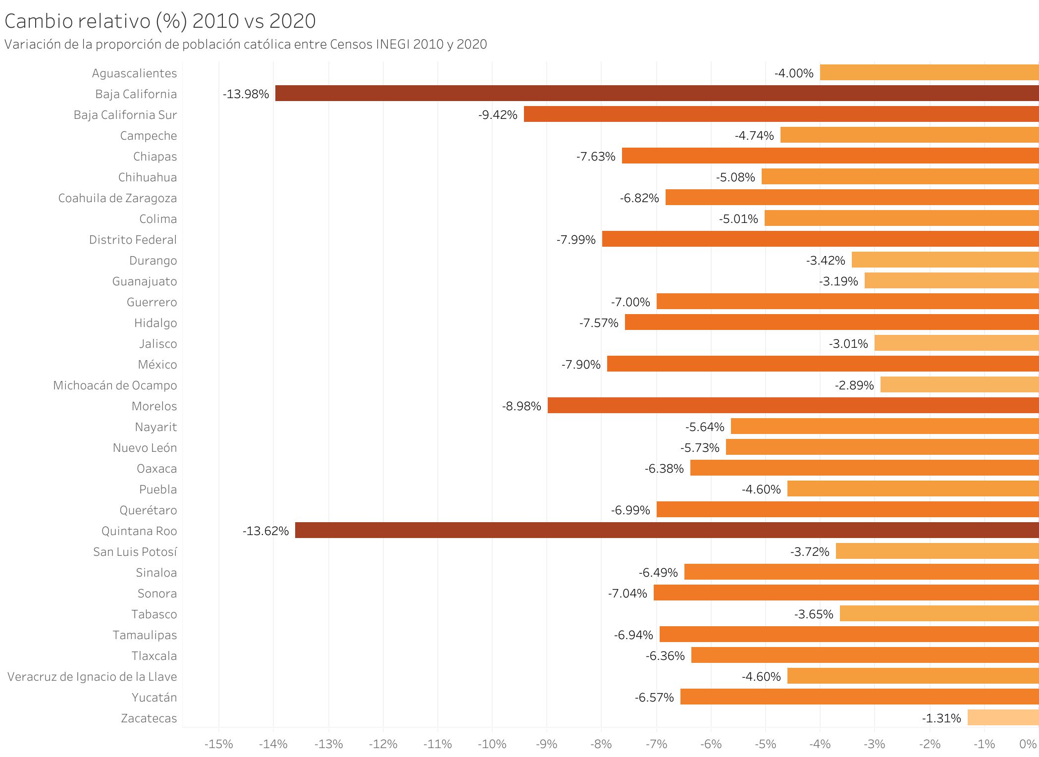 El análisis por entidad federativa confirma esta tendencia: en la mayoría de los estados, la proporción de población católica disminuye, reflejando una transformación gradual en la composición religiosa del país.